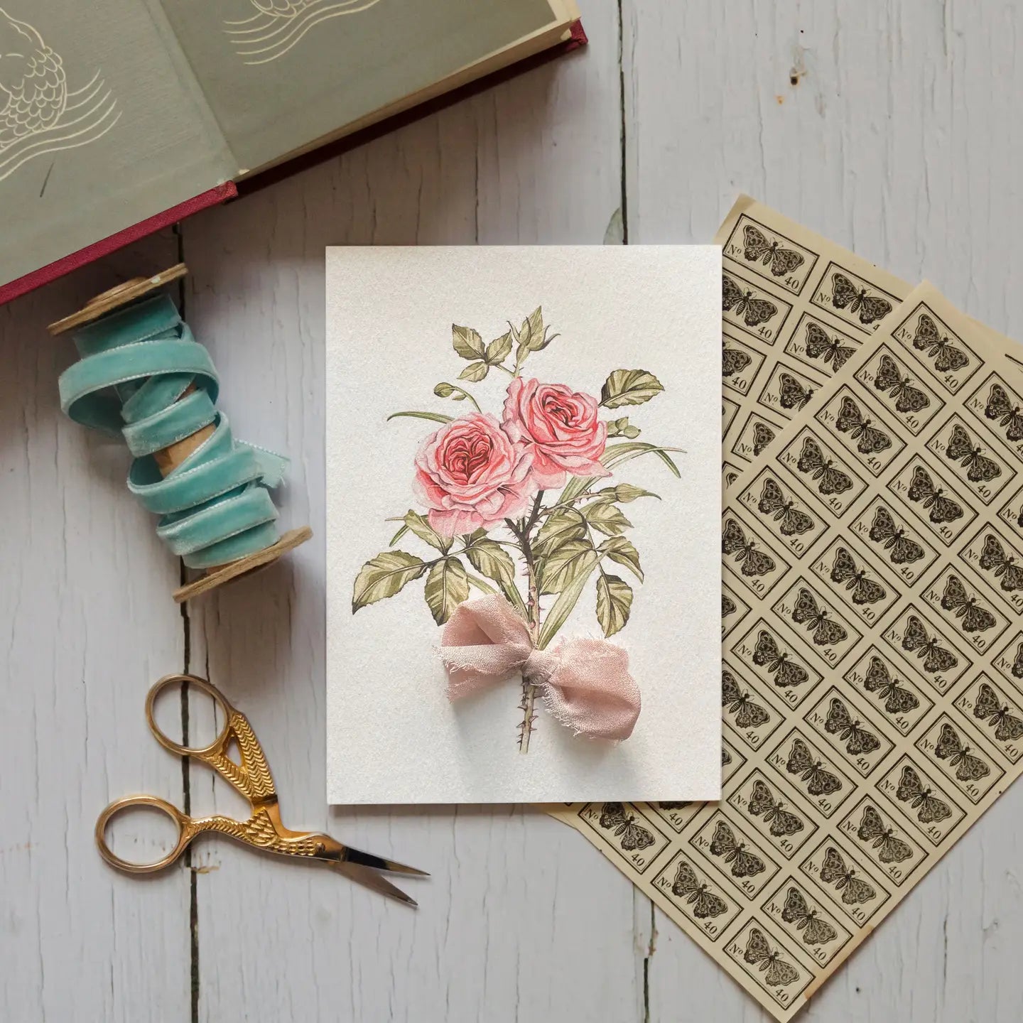 Elevate your greetings with this stunning Pink Floral Hand Tied Silk Ribbon Watercolour Card, where artistry meets elegance! The card features a beautifully rendered watercolour floral design printed onto luxurious textured FSC card stock, ensuring both visual beauty and environmental responsibility. The real magic lies in the hand-dyed pale pink silk ribbon adorning the card, complete with naturally frayed raw edges that add a touch of rustic charm and artisanal character. At A6 size (104 x 148mm), it's the ideal dimensions for displaying on a mantelpiece or tucking into a keepsake box. Whether you're celebrating a special milestone, sending heartfelt wishes, or simply brightening someone's day, this exquisite card combines playful sophistication with genuine craftsmanship that'll be treasured long after the occasion has passed.
