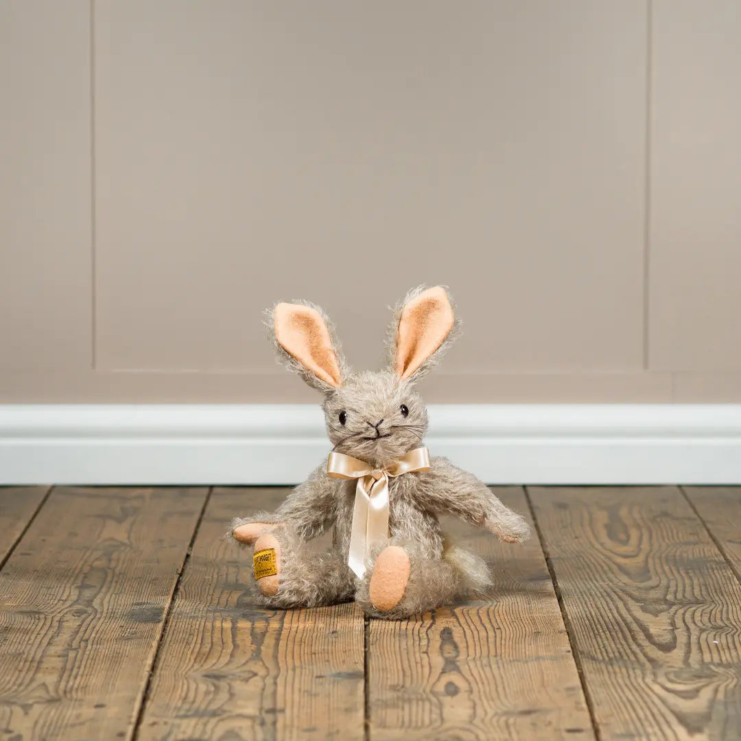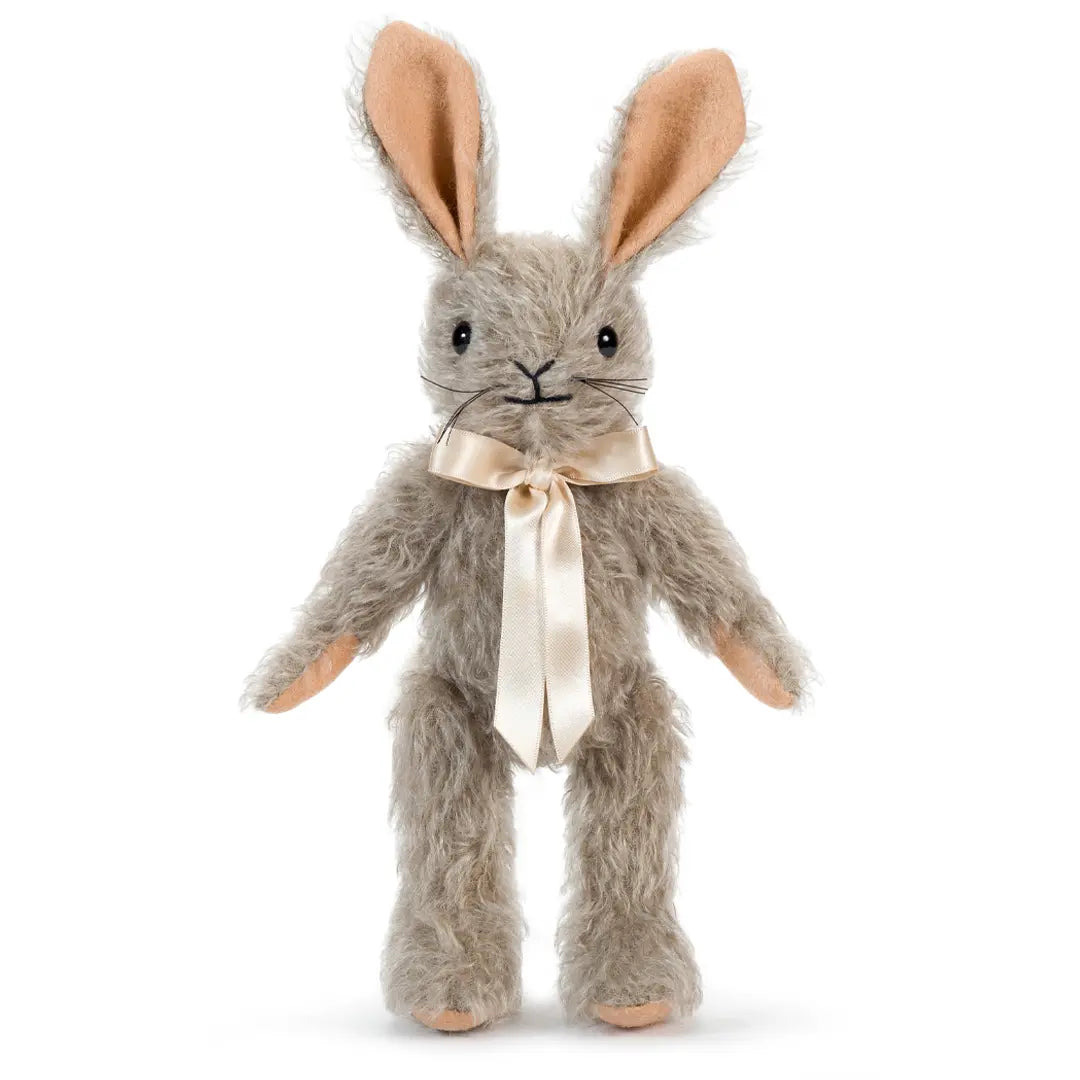 Binky is a trusted companion whose friendly smile will brighten any day. Handmade from dove-grey mohair, he features slender ears lined in pure wool felt and an adorable fluffy white mohair bobtail that perfectly complements his cream satin bow. With his soft, touchable textures and gentle expression, Binky becomes an instant favourite for cuddles and imaginative play.