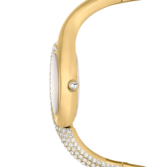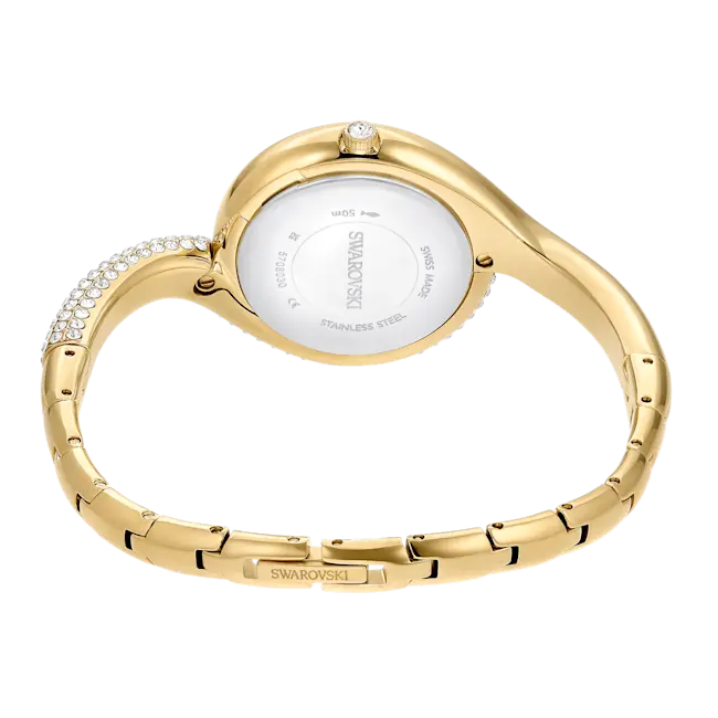 This captivating Dextera watch takes its cues from the classical timepieces of a vintage era. The 29mm stainless steel design is gold-tone finished and creatively embellished with a pavé of clear crystals over half the bezel, as well as half the bracelet. The minimalist dial features a sunray effect and is accented only with three crystal hour markers and a swan logo at 12 o’clock. A total of 203 crystals are used in the creation of this timepiece, including the single crystal that is placed within the crown. This Swiss made watch is water resistant to 50 meters and is a pure expression of Swarovski sophistication.