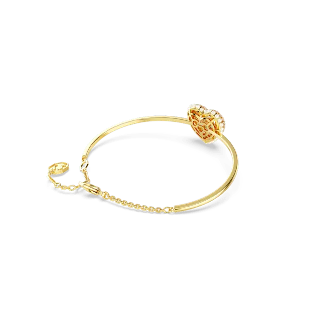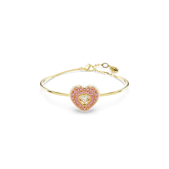 This gold-tone Idyllia bangle expresses love through a combination of colours and cuts. The heart-shaped motif has been created with a cage design for maximum volume and includes an array of tiny white Crystal Pearls around the edging. To enhance the domed effect, it is adorned with round pink Swarovski Zirconia, set in place using the dazzling chatonnage technique. At the centre, a heart-shaped dancing stone catches the light from every angle. Gift this as a special surprise to someone you adore.