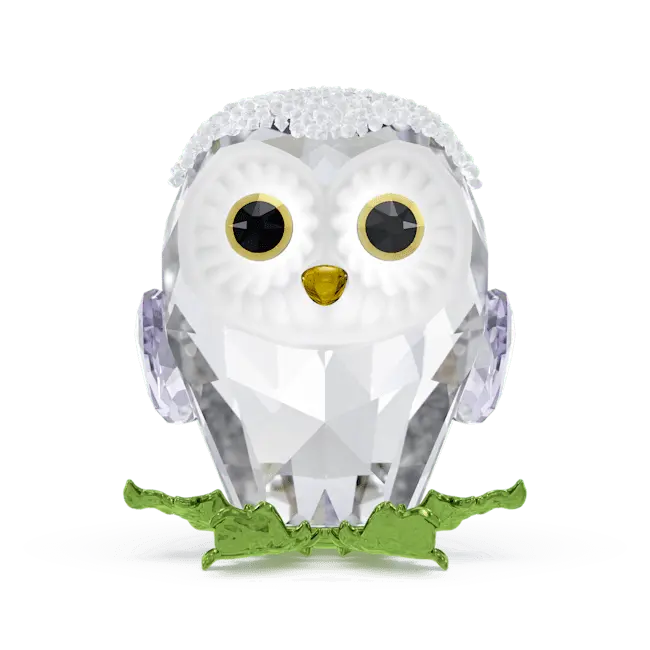 With its bright wide eyes and snow-covered head, this baby owl is irresistibly charming. Inspired by the Idyllia family, the ornament is crafted from 226 facets and approximately 420 crystal rocks. The owl sits atop a branch that is formed from metal with a green surface finish. An enchanting piece that is sure to bring joy to your home décor. Decoration object. Not a toy. Not suitable for children under 15.