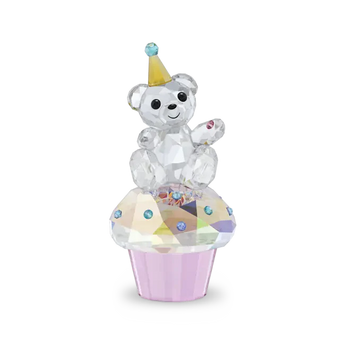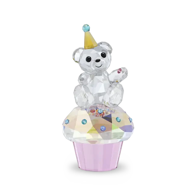 For birthdays, milestones, or any moment worth celebrating, this Kris Bear figurine makes a charming companion. Crafted with 739 facets, the design reveals our cheerful bear sitting atop a delicious cupcake, which is decorated with a joyful pink wrapper, a cake with Swarovski’s Aurore Boreale effect, and various flatback crystals in shades of blue. Enjoy this Kris Bear as a wonderful party centerpiece or a memorable gift on someone’s special day. Decoration object. Not a toy. Not suitable for children under 15.