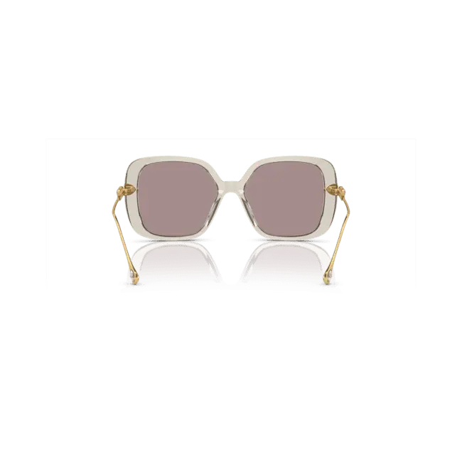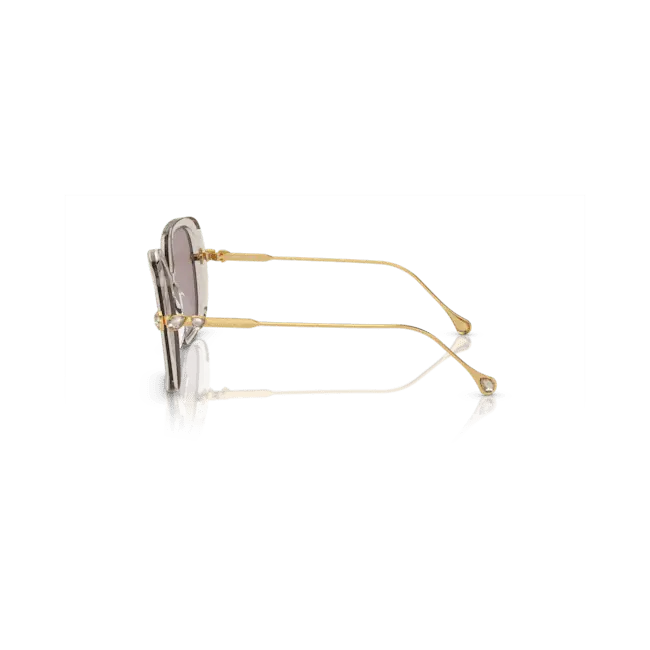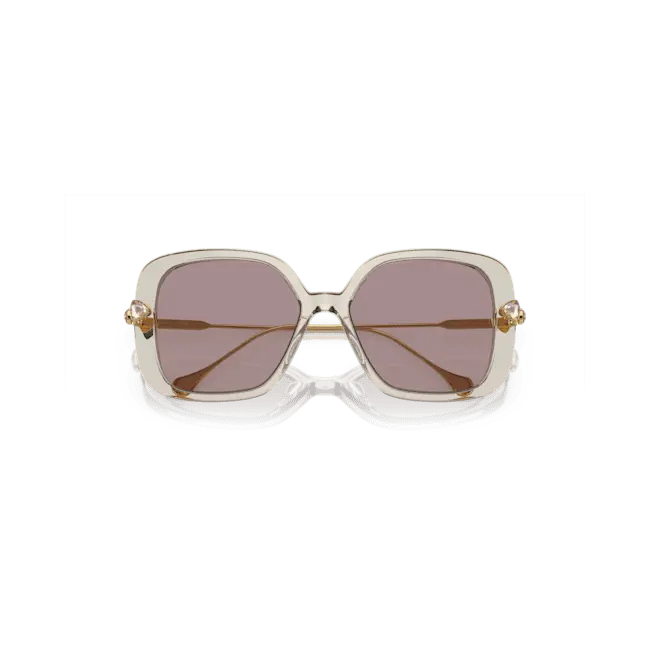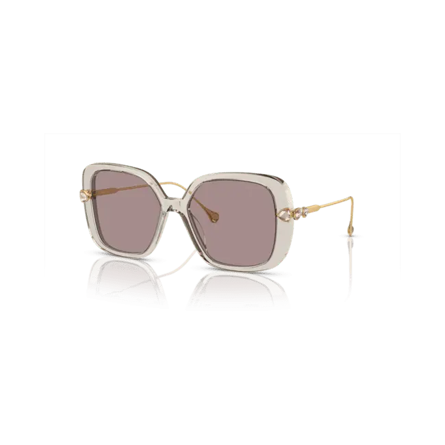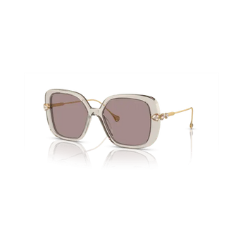 Go for bold glam with these oversized sunglasses featuring a refined touch of luxury. Inspired by our wondrous Mesmera family, the translucent grey acetate frames are crafted with dark purple lenses and a wrap of mixed-cut pink crystals around the metallic temples. An extravagant style that was born to stand out.